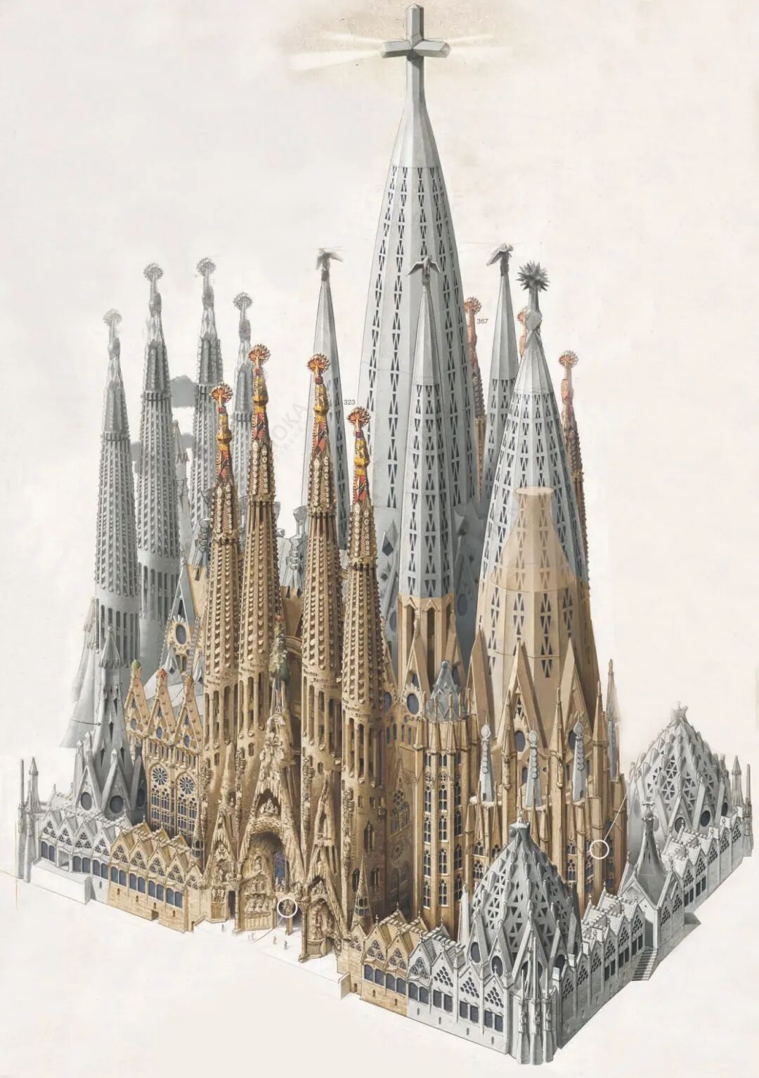 参数化设计甚至可以追溯到19世纪80年代,圣家大教堂的建筑师高迪就采用了参数化的设计思维,在那个非数字化的年代,高迪通过可变模型来推敲设计,将转动的框架和弹性的绳索作为变量,在没有精确数据的条件下,通过在石膏模型上试验得出,这种设计手法与形体的创新,开创了参数化设计的先河。