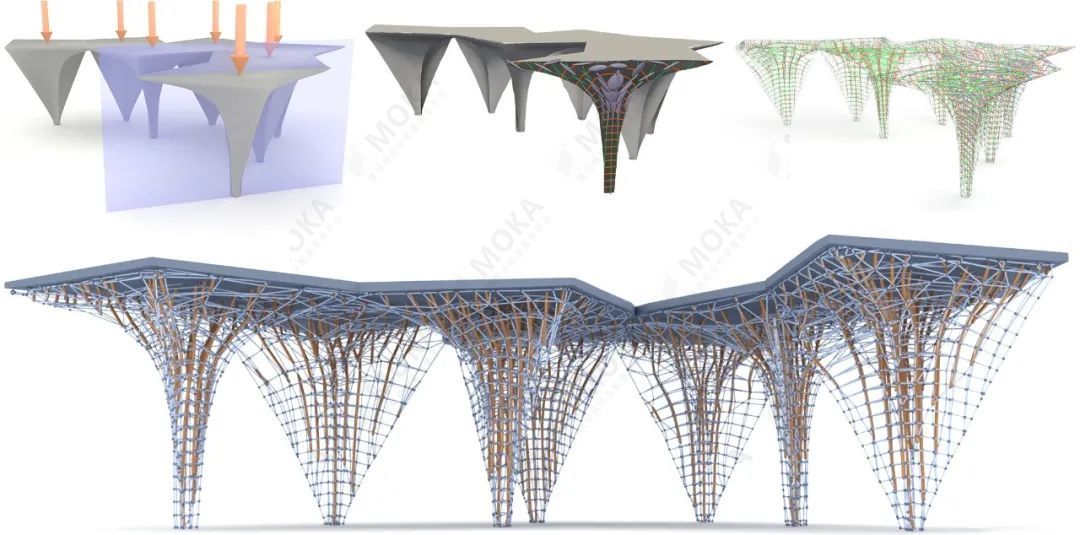 结构设计中的杆件结构分为平面结构和空间结构,在平面结构中,各杆的轴线和外力的作用线都在一个平面内,但是目前很多非线性的设计中,杆件多为复杂的空间结构,各杆的轴线不在同一平面内,此时传统的二维设计思路就需要发生转变,借助参数化设计的方法,不但可以批量生成空间的结构杆件,还可以对杆件的长度模数以及荷载进行优化,同时能够提取全部的下料信息。