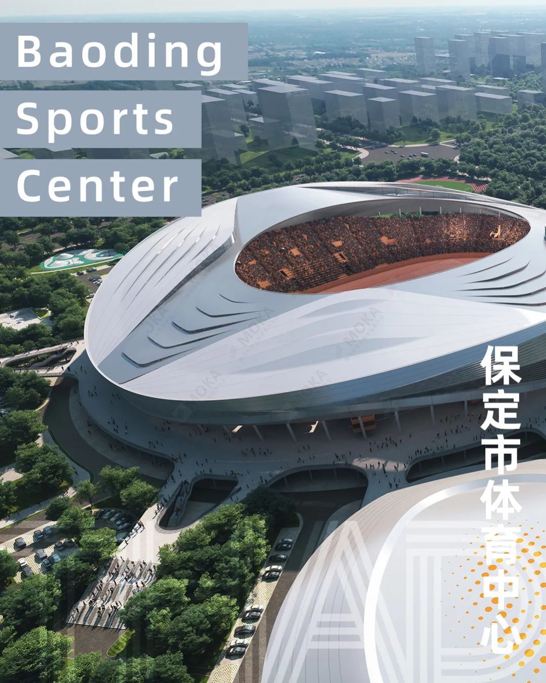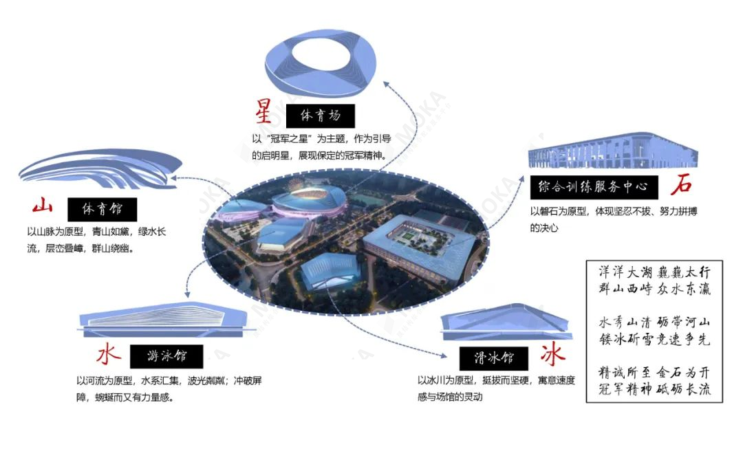 项目规划布局以“天地方圆”为理念,建筑设计赋予各个单体建筑其特有的元素理念,如以“冠军之星”为主题的体育场,以“山脉”和“河流”为原型的体育馆及游泳馆,以“冰川”为原型的滑冰馆,以“磐石”为原型的综合训练服务中心,共同打造保定市建设的新颜值。