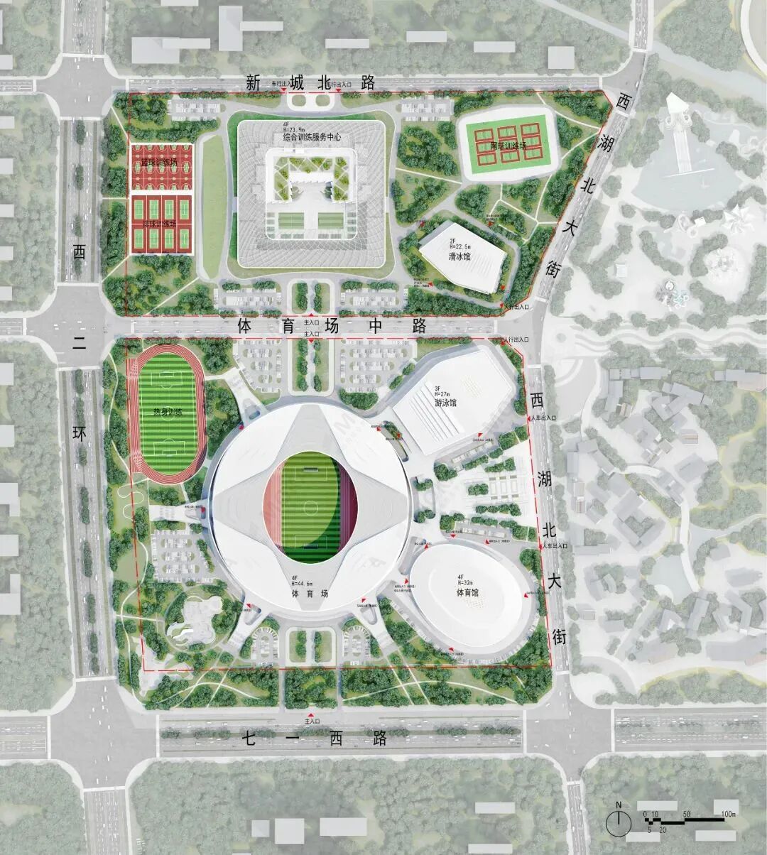 方案由北侧综合训练服务中心及南侧体育场构建为城市主要空间主轴,在各个方向均具备良好的可达性。