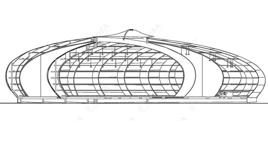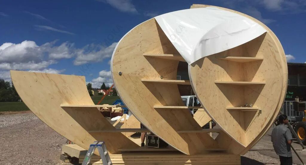 支撑结构必须稳定并节省材料,控制生产成本。最终的建筑体量是由三个相互咬合的木质壳形肋状结构支撑,并以ETFE膜结构作为维护结构。它类似于一个帐篷,ETFE膜仅用钢索与肋状主框架和地面连接,并且与木结构一起形成支撑结构。
