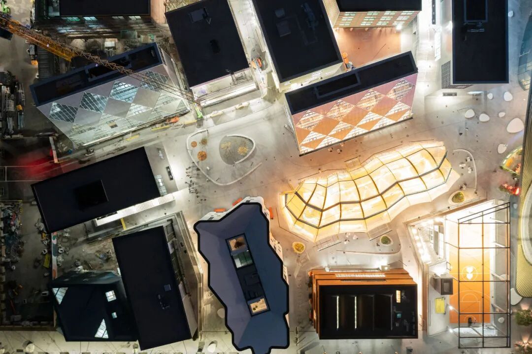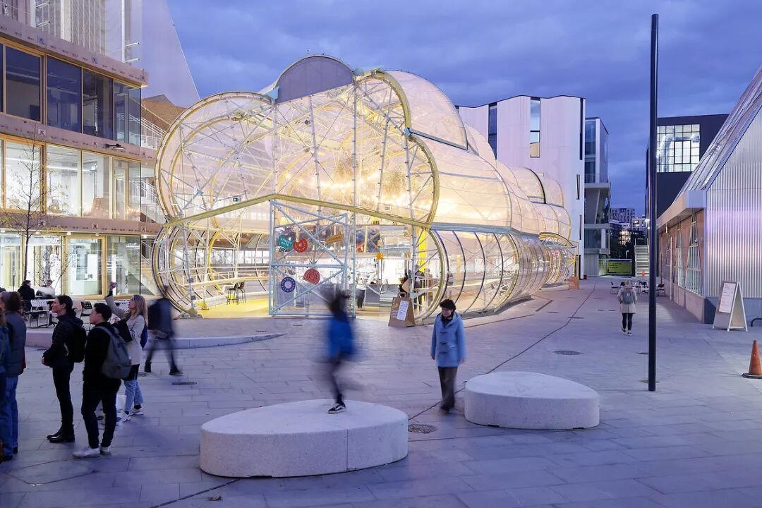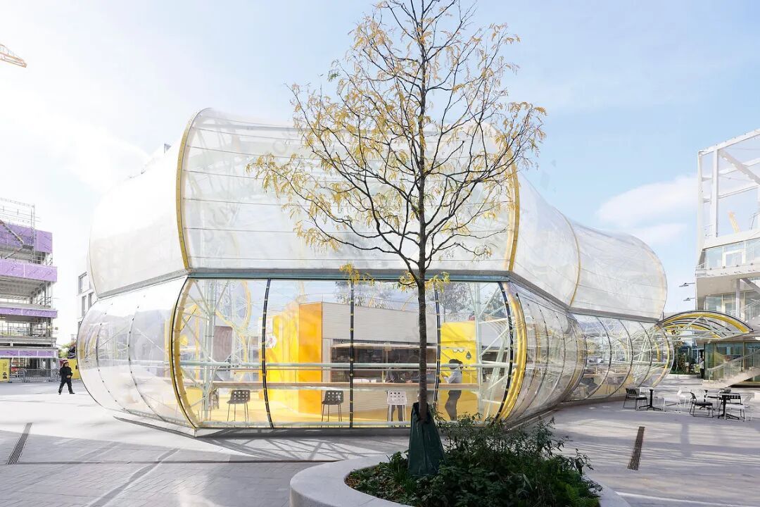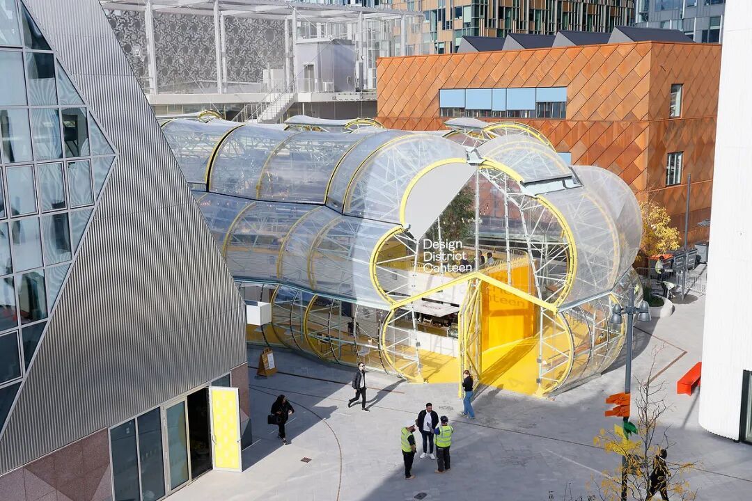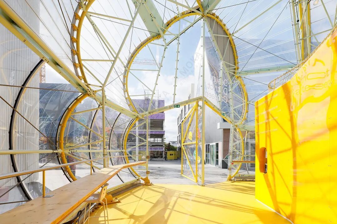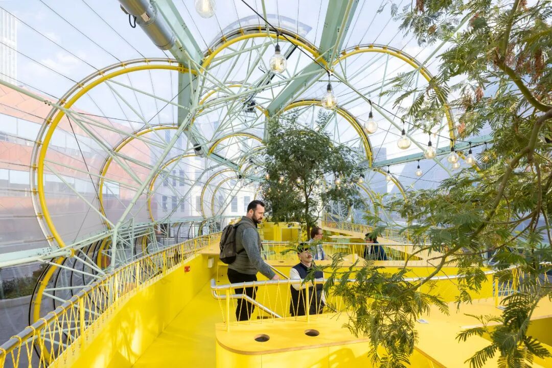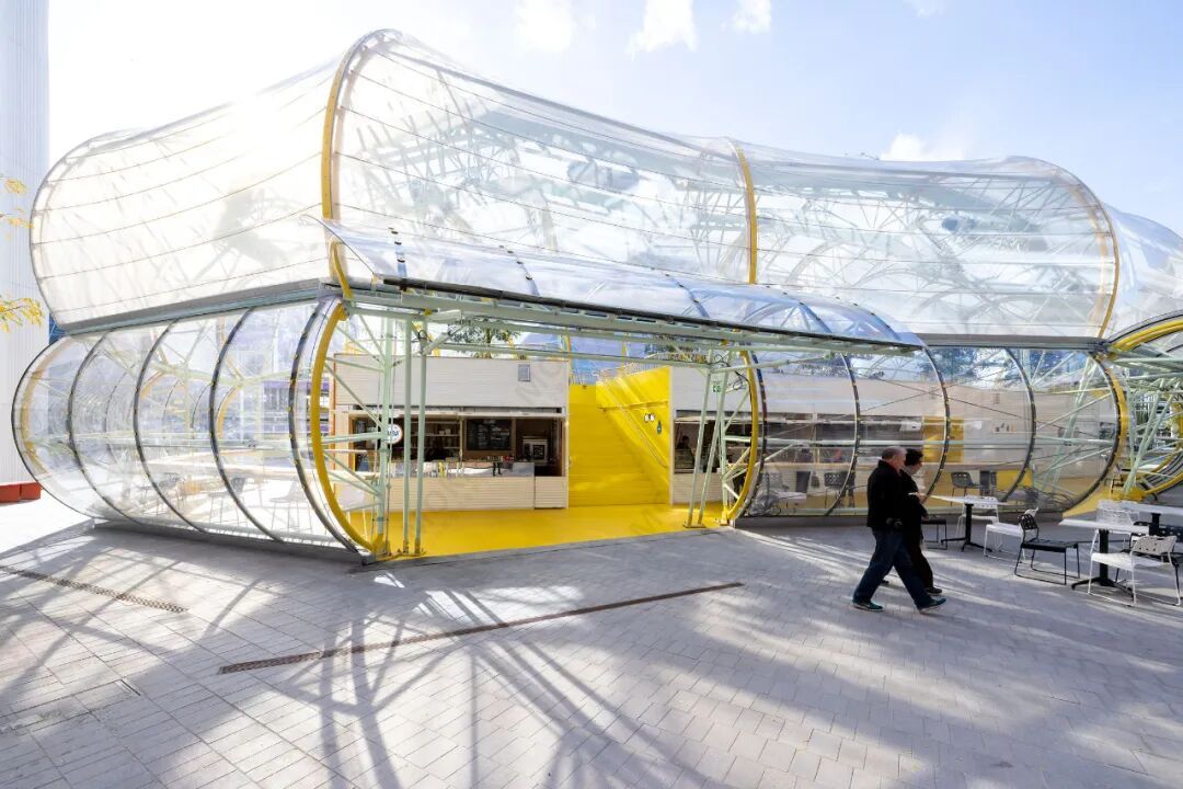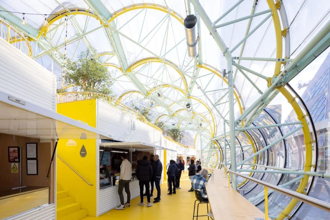 项目以充满活力的黄色为主色调,外表皮由轻金属结构和透明ETFE膜壳组合而成。这个ETFE薄膜结构被细分成了不同的独立面板,其中一些可根据需求操作,便于建筑内部通风,并为室内创造一种“露天”市场的街头氛围。