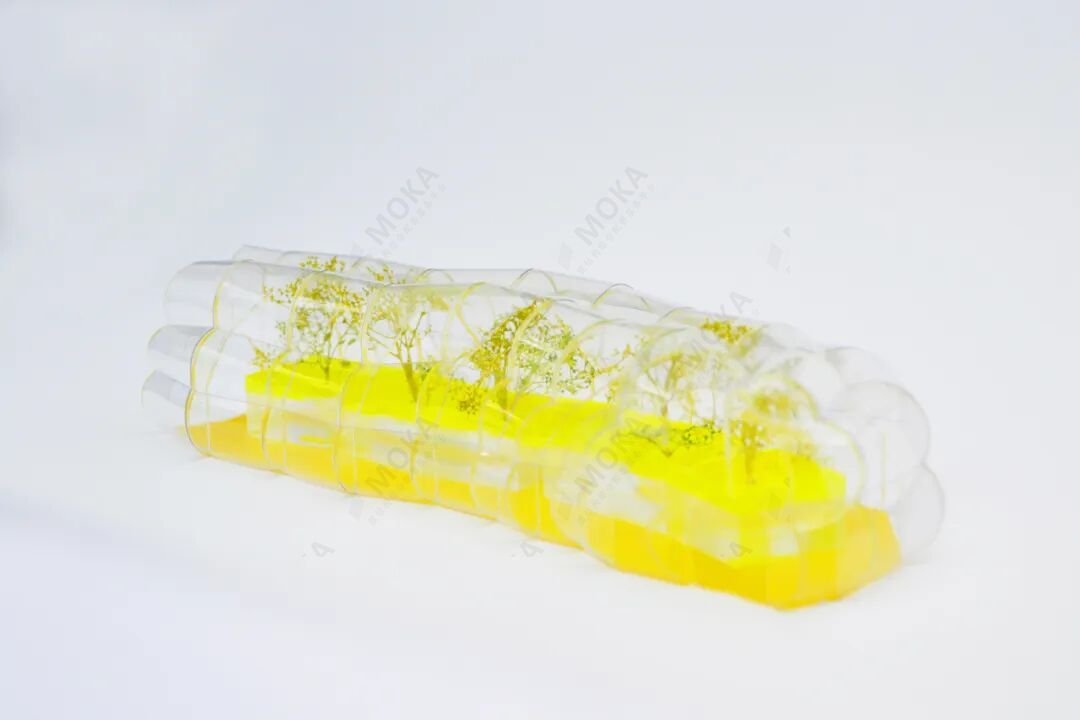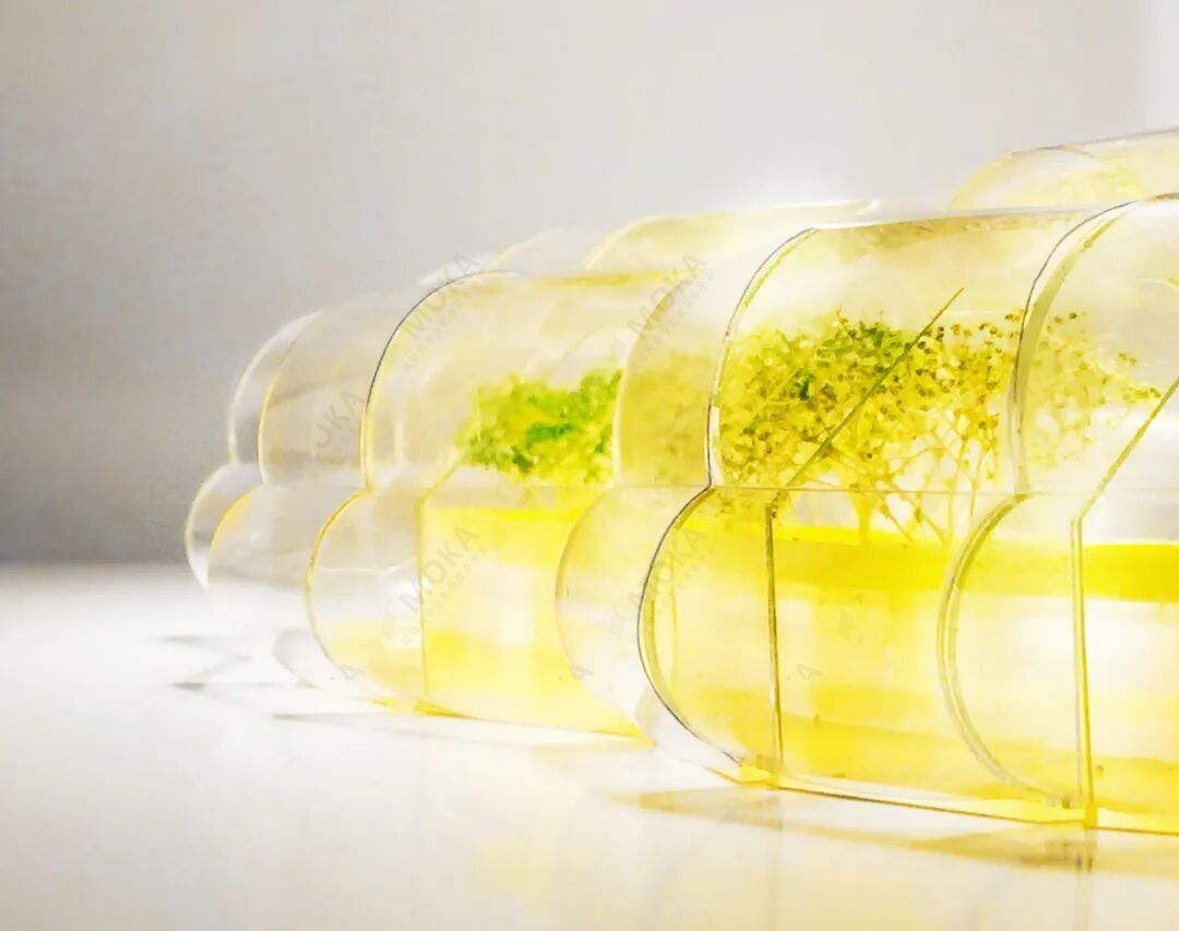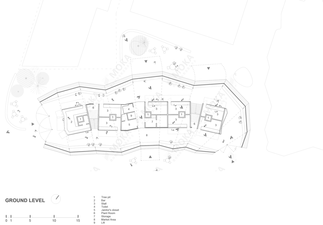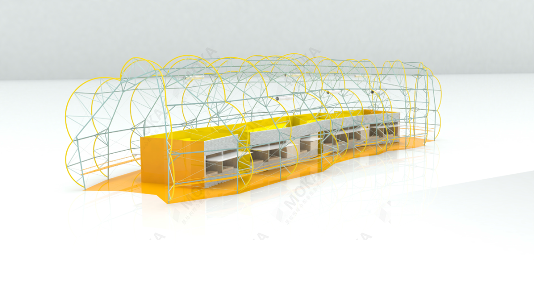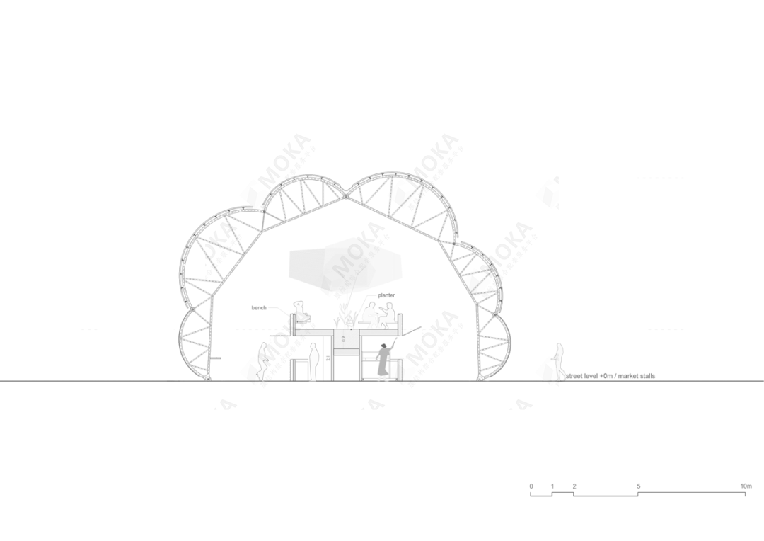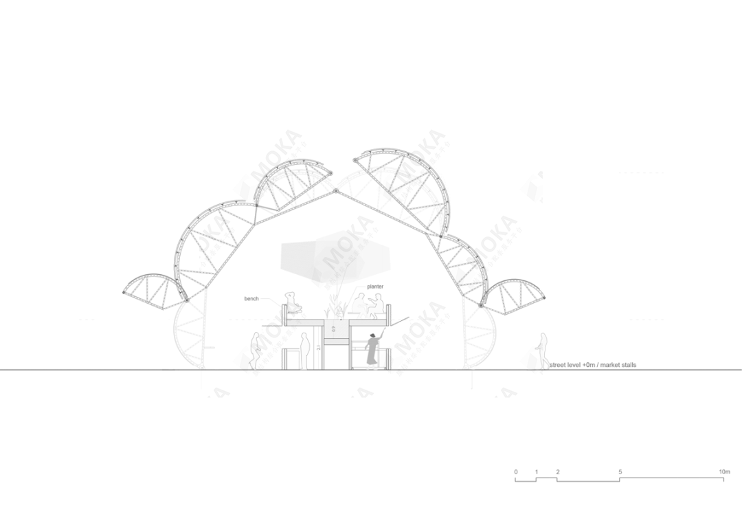 透明外表皮下覆盖的脊柱状空间,则是项目的核心功能区,即集市本身。这个“脊柱”的每边都可以用作摊位展示,而座位区则在它上面,并种有绿植。