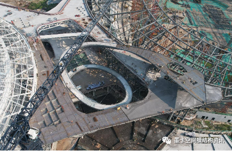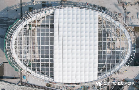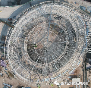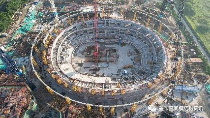 体育馆于2021年9月外圈压环梁首吊,10月完成外圈压环梁吊装和内圈压环梁首吊,12月完成施工。