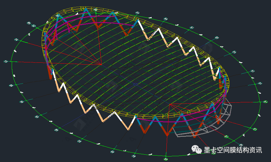 德胜体育中心绿化屋面A旋转坡道采用倒三角变截面双曲桁架,精度要求高,针对结构特点,项目团队与设计研究院及加工厂多次进行专项技术讨论,共同制订详细的加工制作方案,确定工艺参数及关键控制点,为后续现场施工打下了良好基础。