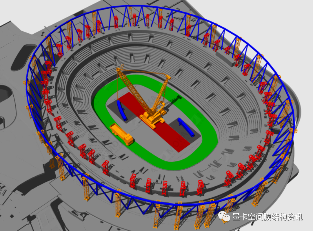 体育馆外圈压环梁总长约370米,重约1300吨。外圈压环梁首次采用悬挑式Y型支撑胎架,结构形式新颖,受力分布科学合理的同时节省了施工成本。