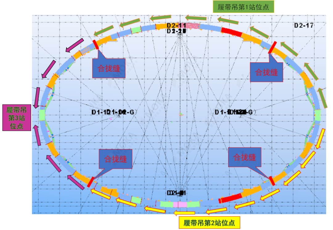 德胜体育中心游泳馆压环梁采用大型400t履带吊在内圈地下室顶板上吊装作业,将大量高空焊接转移到地面拼接焊接,优化了作业结构,提高了吊装效率,降低了安全风险。