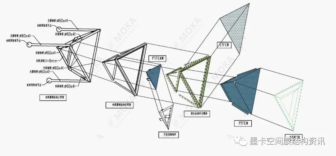 每个照明单元均为双层膜构造,外敷透明ETFE膜(日本产,旭硝子Fluon 250μm);内衬银色PTFE反光膜(中国产,科力1605)。ETFE膜总计约500㎡,PTFE膜总计约800㎡。每个单元内部均为可拆卸设计,满足灯光的检修与灯具更换的需求。