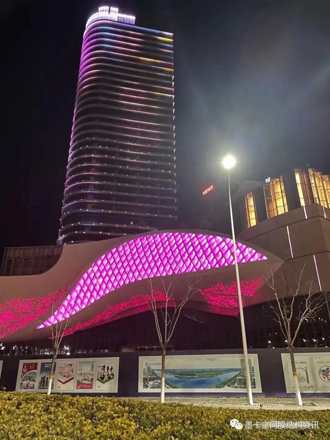 本工程通过膜材与灯光的综合设计,使日景与夜景效果均独树一帜。夺人耳目的造型及灯光效果使其成为商业地标性建筑。